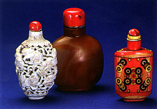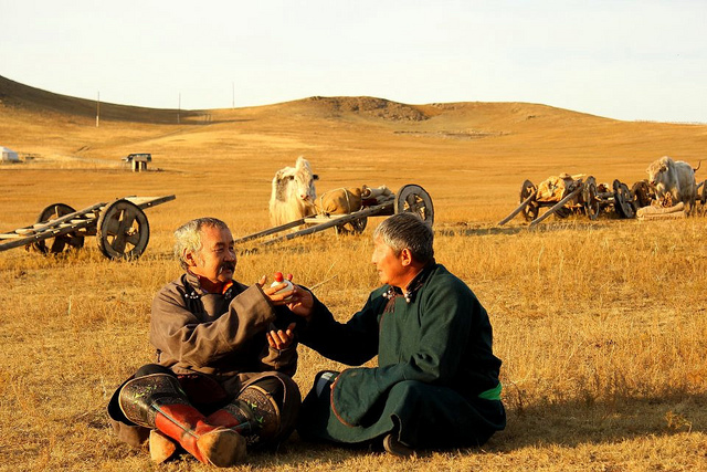 As a result of the influence of China and Tibet in the Manchu-Chin dynasty, Mongolians started to use khuurug or snuff-bottles. Khuurug have a similar use to that of European snuffboxes, but the shape is notably different, being fashioned like a small bottle. The Mongolian khuurug can be crafted from various kinds of stone and the cap or “head” is particularly important and is therefore made from coral. The craftsmanship used to carve out the inside of the bottle is also a reflection of its quality. The harmony between the head and the bottle, the detail on the bottle shoulder and the colour are features which differentiate the Mongolian khuurug from Chinese snuff-bottles. Usage of the khuurug has brought many unique elements to Mongolian culture, such as a greeting made by passing the khuurug, and has resulted in the discussion and collection of different examples.