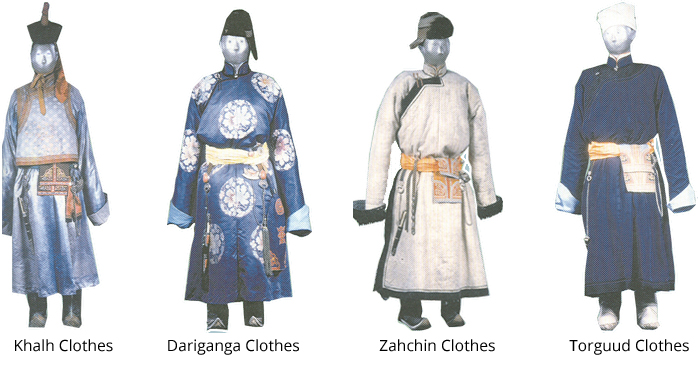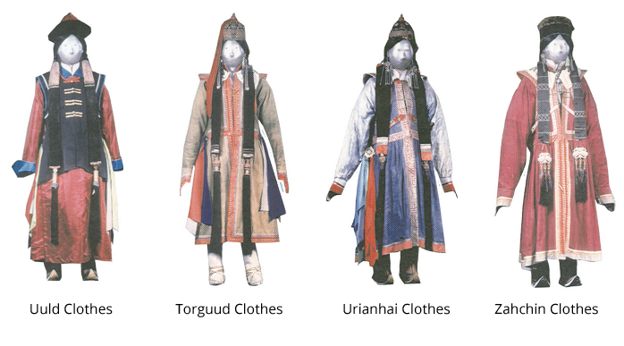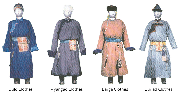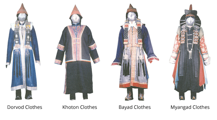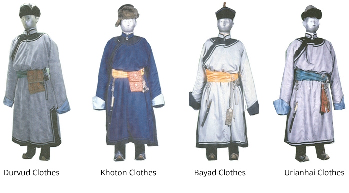 Because of the different ethnic groups residing in Mongolia, there are distinctions in the way they all dress. Therefore it is estimated that between them all, there are about 400 different types of garments, 20 boots, 10 sashes and 20 types of hats.