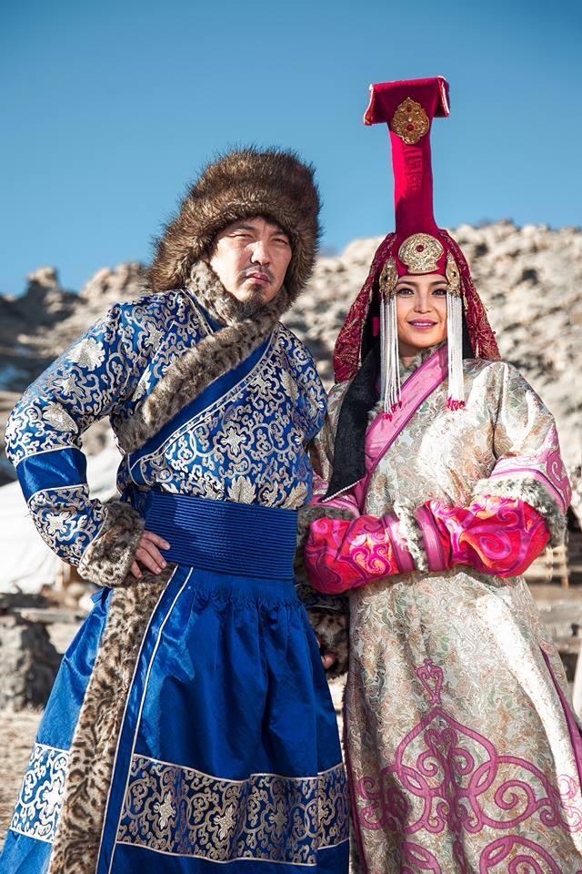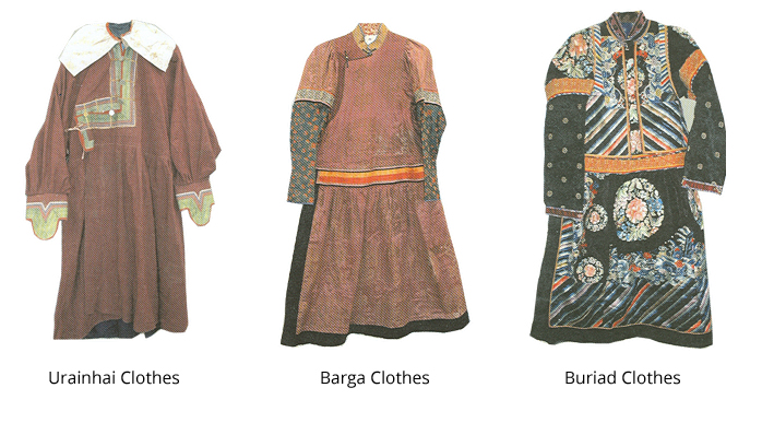 The del is the Mongols' traditional garment worn on both workdays and special days. It is a long, loose gown cut in one piece with the sleeves; it has a high collar and widely overlaps at the front. The del is girdled with a sash.