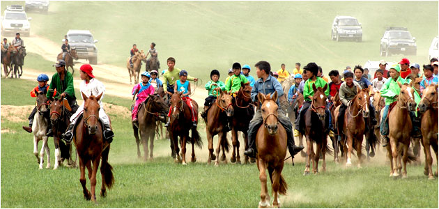 Horse racing is an important part of Naadam. This sport is also centuries old, dating back to the Bronze Age. Horses are divided into five groups: 2, 4 and 5 years old, over five years old and stallions. The riders are aged from 5 to Y. I. 12. Mongolian children are excellent riders as both girls and boys ride from infancy. As the popular saying goes "The nomad is born in the saddle".