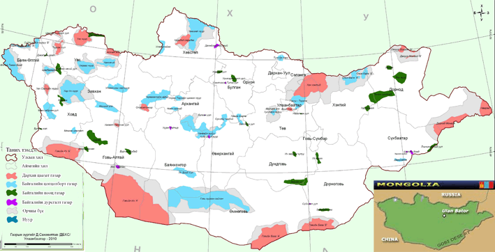 The 62 protected areas in Mongolia now constitute an impressive 15% of the country. The strictly protected areas of Bogd Khaan Uul, Great Gobi Desert and Uvs Nuur Basin are biosphere reserves included in UNESCO’s Man and Biosphere Project.